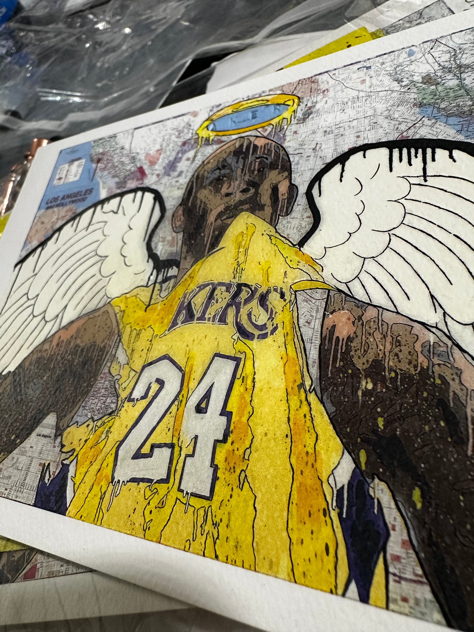 A tribute to legacy, discipline, and the spirit of Los Angeles, this Kobe Bryant artwork is offered here as a 5x7 archive edition print. The piece features expressive street-inspired detail, a Los Angeles map background, angel wings, halo elements, and the iconic No. 24 jersey — created to honor both the athlete and the city he represents.